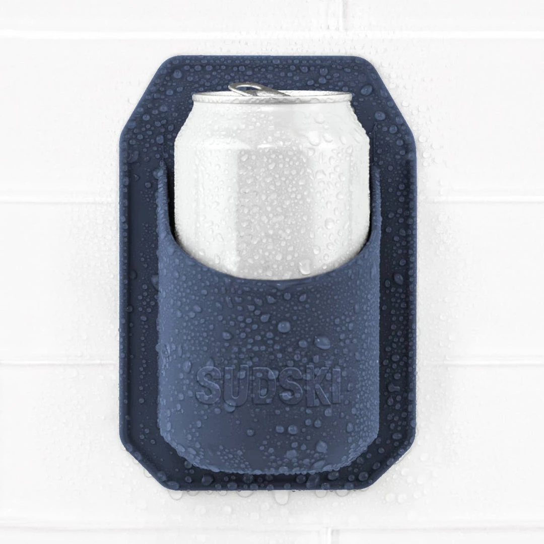 The silicone SUDSKI™ Shower Drink Holder securely grips to glossy surfaces like glass, mirror, marble, metal, shiny tiles, and laminate using a patented technology.