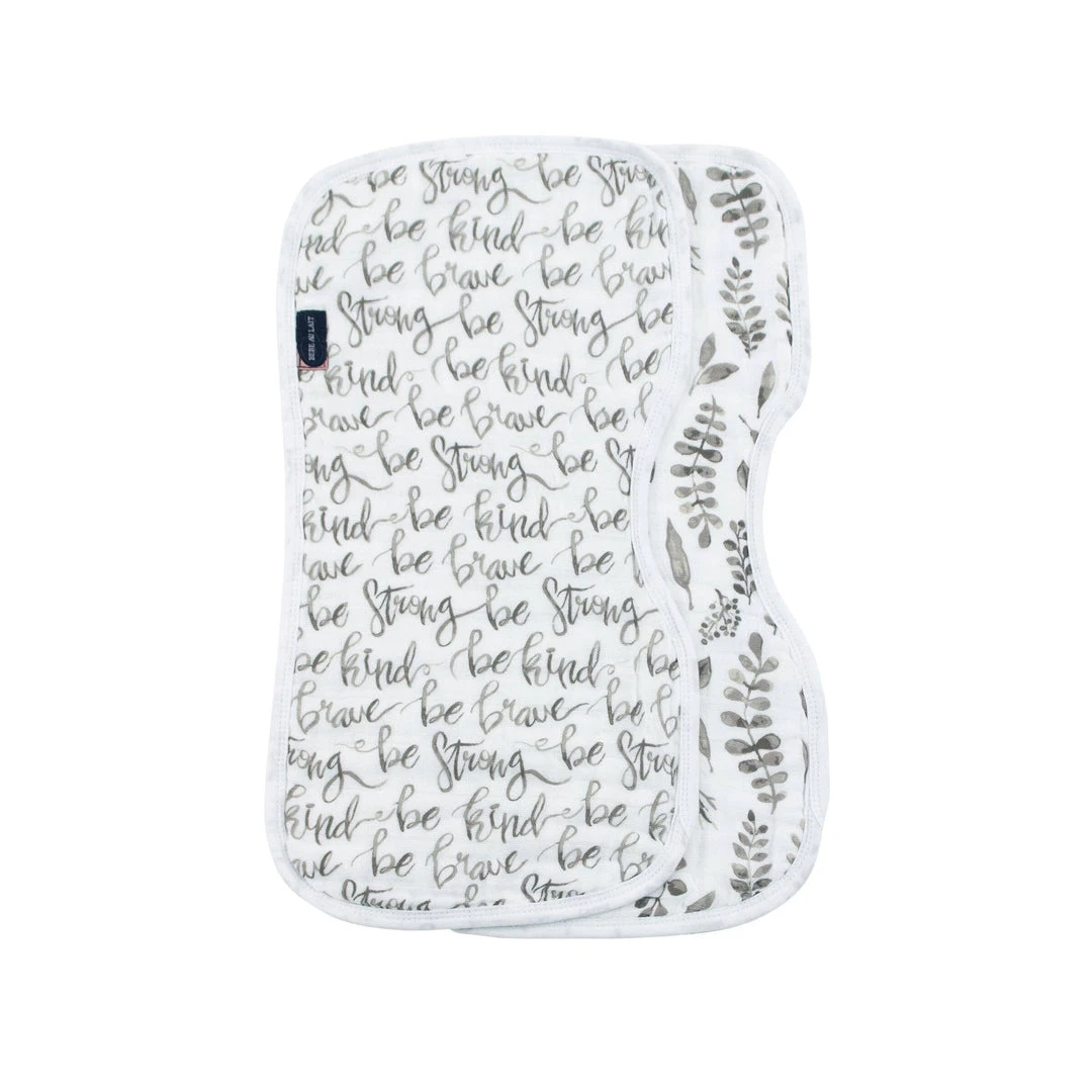 Just Be: Be brave, be strong, be kind. From day one, inspire your little one with words of positive meaning. Leaves: Olive and eucalyptus leaves decorate this sold white background in a peaceful vibe.