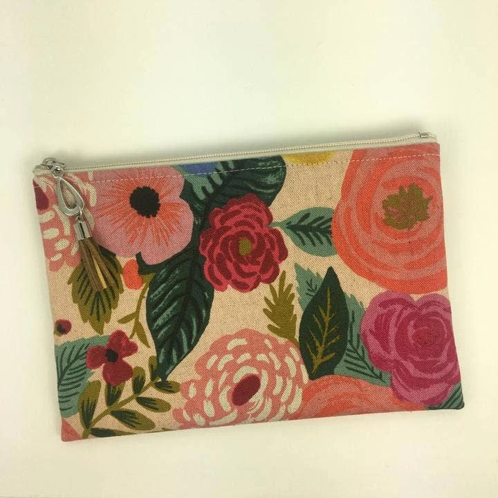 Measures 7.5″ x 5″, featuring a suede tassel, cotton printed lining and a zipper closure. Available linen/cotton prints. Spot Clean.