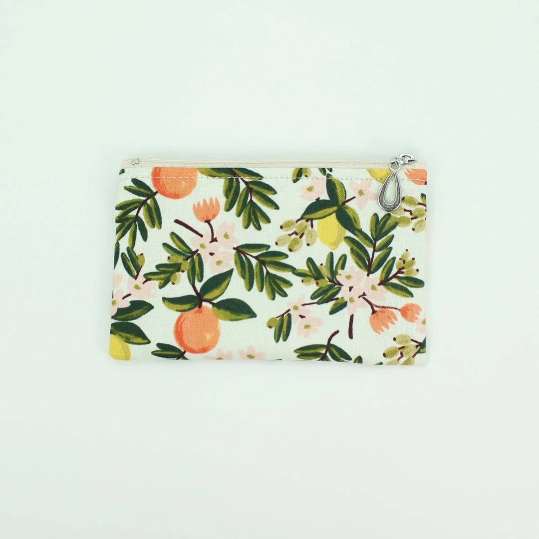 Measures 5″ x 4″, featuring a cotton printed lining and zip closure. Spot Clean.