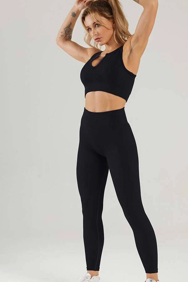 Ribbed knitted two pieces activewear. This seamless two piece set shapes by stretchy ribbed knit with a top that boast a sexy notch neckline, sleeve fitted bodice with cropped hem. And a leggings with a high, elasticized waist with wide waistband, and slightly cropped pant legs.