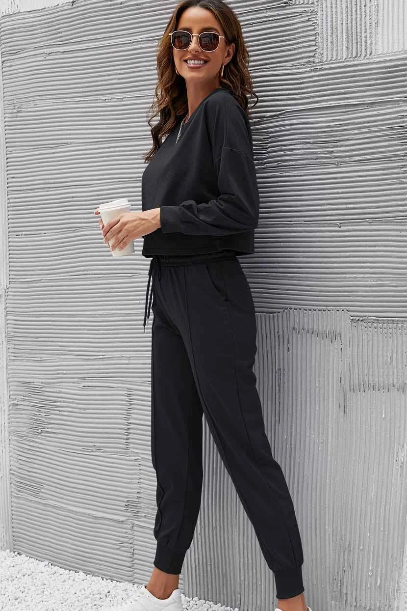 Cropped top and pant knitted two pieces set. This two pieces set shapes by lightweight knitted fabric that has a cropped top with round neckline, long sleeves. And a cropped pant with drawstring high waist and tapered legs.