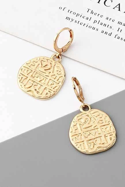 Gold dangled carved alloy earrings. These shiny gold-toned earrings have a small hoop design with a dangling carved alloy charm. 1.57″ long.