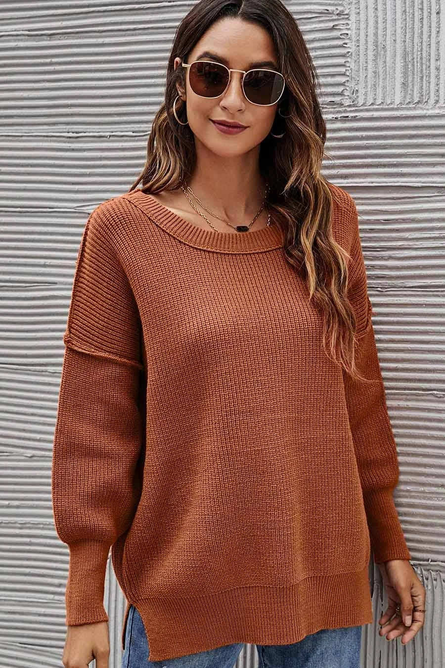 Casual loose long sleeves sweater. This sweater features a rounded neckline, long sleeves, drop shoulder with seamed details, and a relaxed bodice with side notches. Normal neckline.