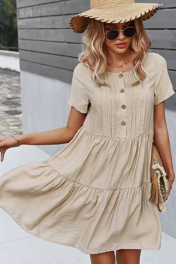 Summer days ruffled short dress. Lightweight woven fabric shapes a round neckline, short sleeves, a pin-tucked bodice, tops a tiered ruffled mini skirt. Unlined.