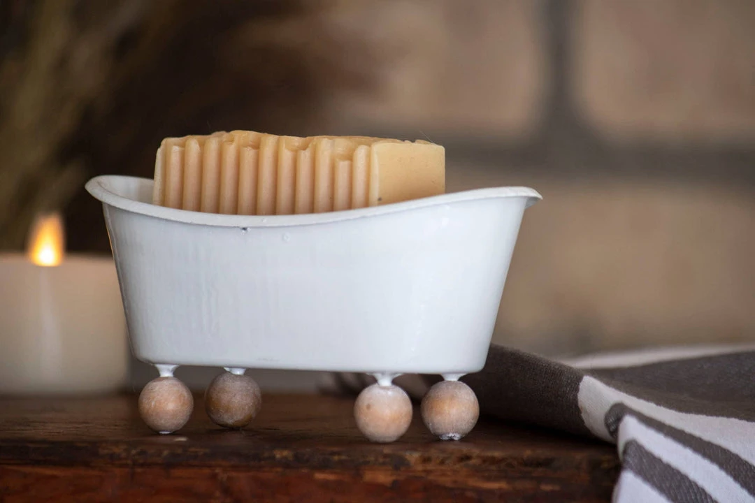 Get soapy and clean in fun fashion when you store your bar of soap in this miniature bathtub. Perfect in the bathroom or at the kitchen sink, the white metal soap dish with light wooden ball legs will fit right in with your vintage, traditional decor. This piece can also be used as a dainty, mini planter! Truly versatile is its function and perfectly modern with its clean, white enamel finish.