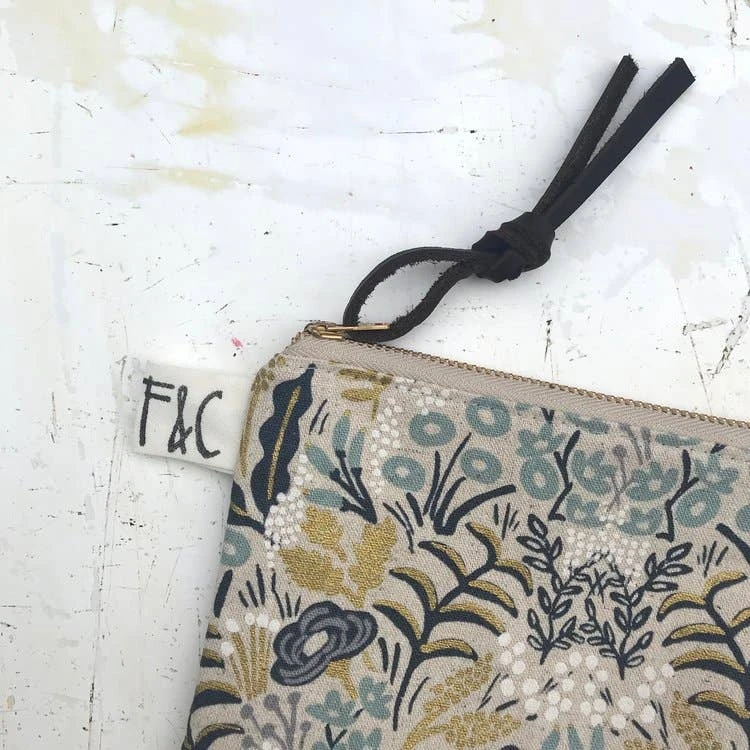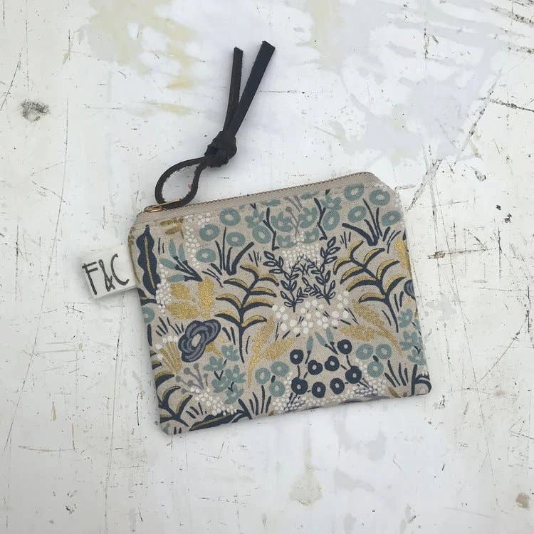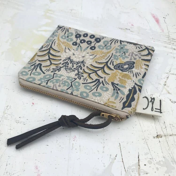 Versatile, handcrafted, fully lined small zippered pouch / purse for organizing or storage. Made out of a lovely metallic floral linen canvas designed by Rifle Paper Co.