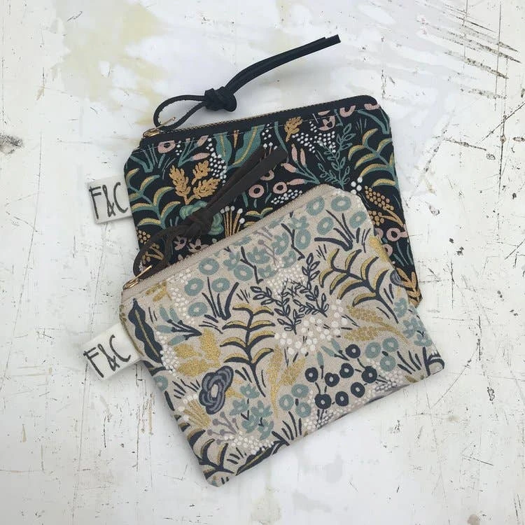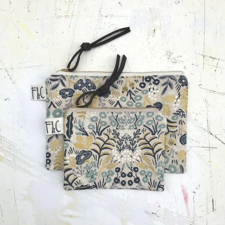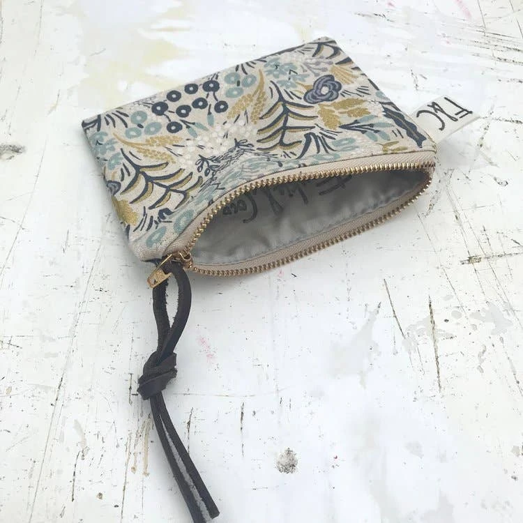 Versatile, handcrafted, fully lined small zippered pouch / purse for organizing or storage. Made out of a lovely metallic floral linen canvas designed by Rifle Paper Co.