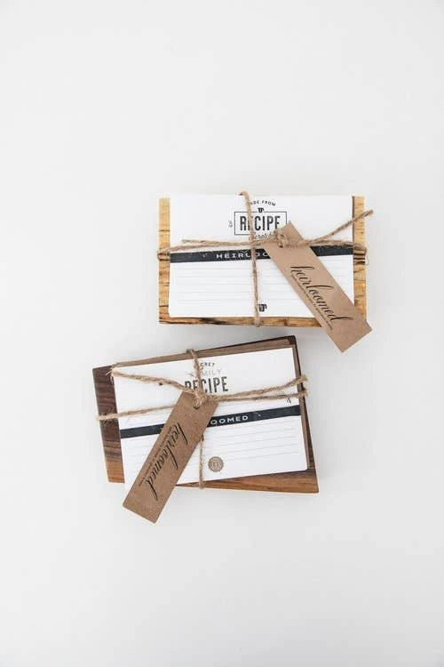 Combine our Recipe Cards + Wooden Recipe Card Holder for a wonderful gift package. Each holder is handmade from a variety of wood, including pecan, black walnut, maple, cherry or other varieties from the wood shop. Each bundle will come with a set of 15 recipe cards. They are the perfect way to capture handwritten family recipes, archiving these treasures to be passed down for generations.