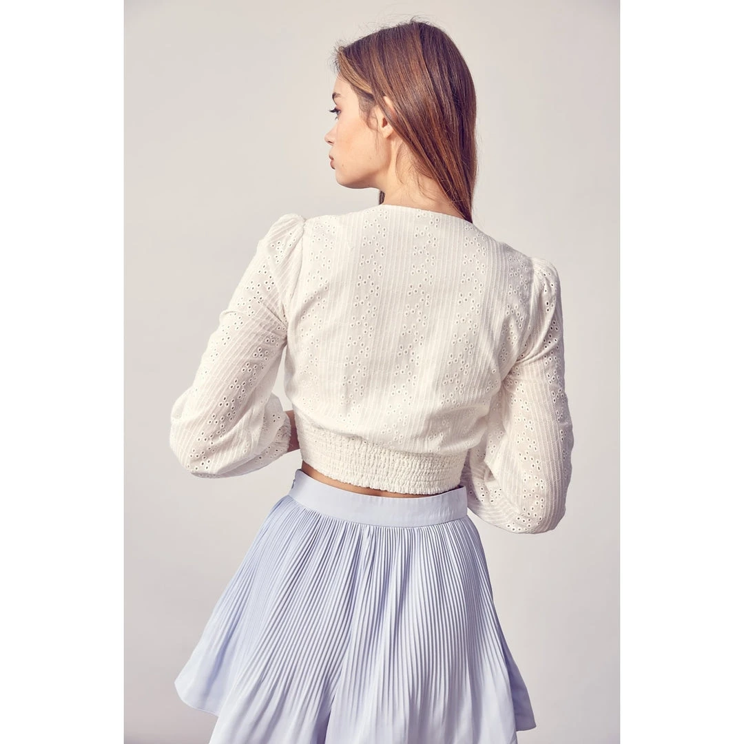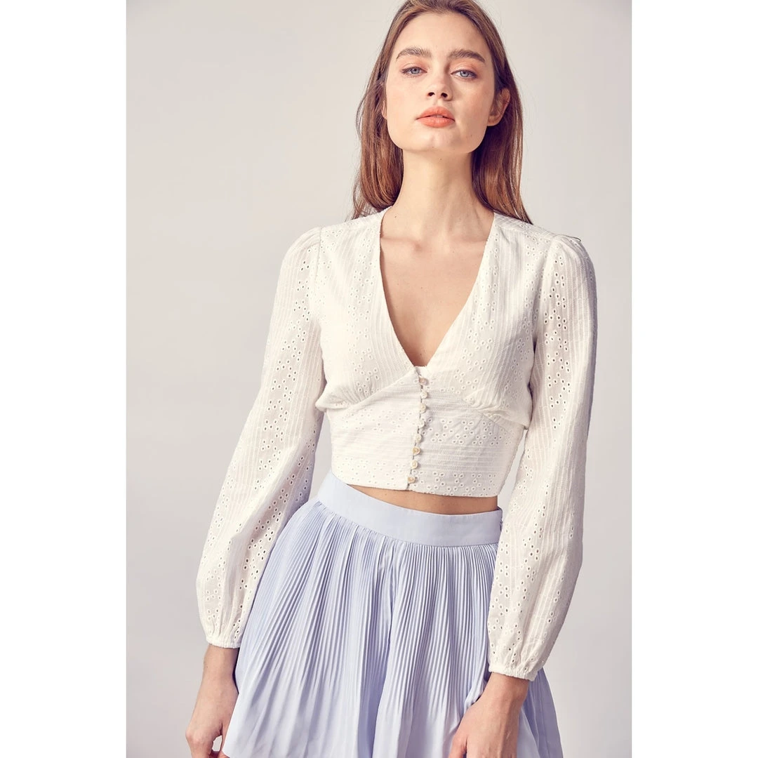 Eyelet cotton button-down blouse. 100% Cotton.