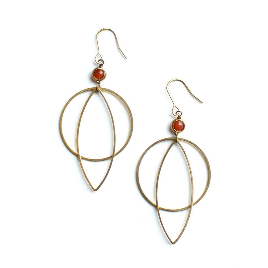 This design is modern with a hint of mysticism. They feature raw brass layered hoop and marquise with small stone accent. Earring are 2.5″ long from top of hook. Choose from Blue Kyanite or Carnelian.