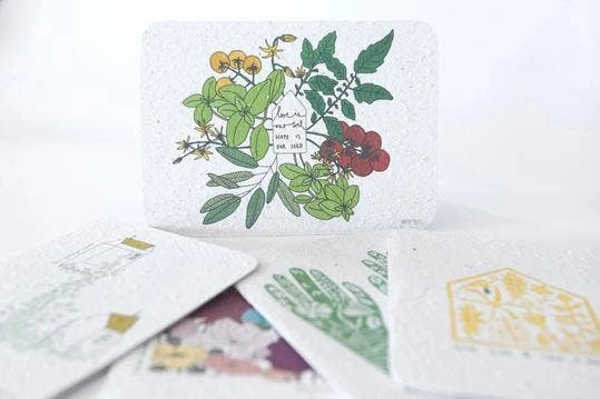 Greeting cards made in South Africa with recycled paper and seeds, giving the recipient the option to plant the card and grow flowers such as snapdragon and alyssum. All cards are 4 x 5.5″ and blank inside. The Sustainable Season Project was lovingly created by Growing Paper, in partnership with WWF and local artist Anja Stoeckigt from Papertales. These cards were produced as part of an initiative to create jobs and opportunities in South Africa, in the wake of the COVID-19 Pandemic.