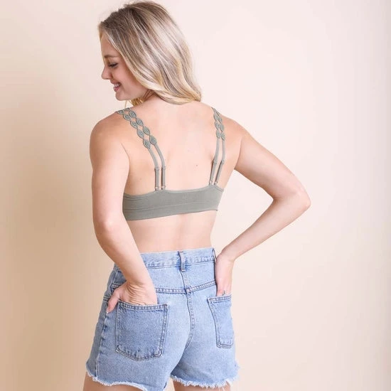 Olive Boho Eye Lace Applique Padded Bralette. 92% Nylon, 8% Spandex.