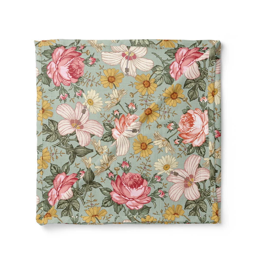 Swaddle your little girl in the comfort of wildflowers with this garden floral cotton muslin blanket. These lightweight cotton blankets feature an earthy blend of greens, yellows, pinks, and cream hues to hint at a fragrant garden bursting into life during a warm spring day. Ideal for spring newborn photo shoots, or any time you want to treat your baby girl to a bouquet in fabric form, you will love holding her as she luxuriates in the comfort of a perfectly placed swaddle.