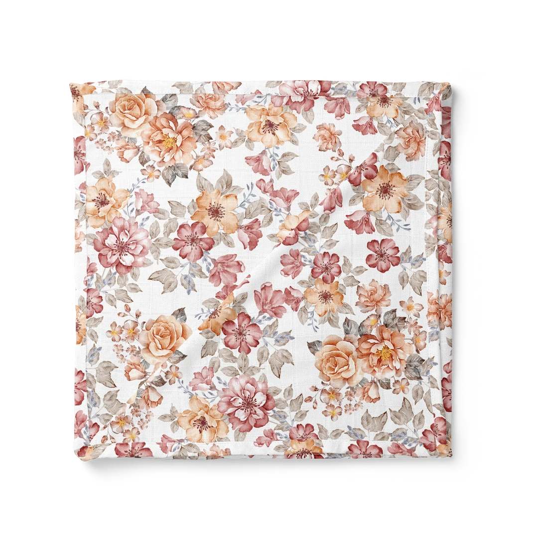 Swaddle your child in the sweet embrace of a sunset floral when you treat them to this muslin blanket. Each of these lightweight, breathable swaddling blankets are lovingly crafted to offer you and your child the most delicate and delightful swaddling experience. Crafted using a vintage inspired print, this floral swaddling blanket features a symphony of peach, yellow, orange, and tan hues kissed with pops of muted foliage for a truly soothing autumn aesthetic.