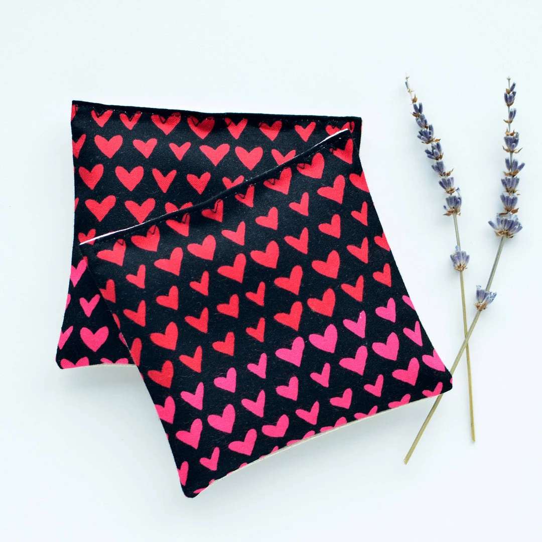 of organic lavender flowers. These sachets are handmade with cotton fabric featuring a pink and red heart motif on black and natural linen fabric.