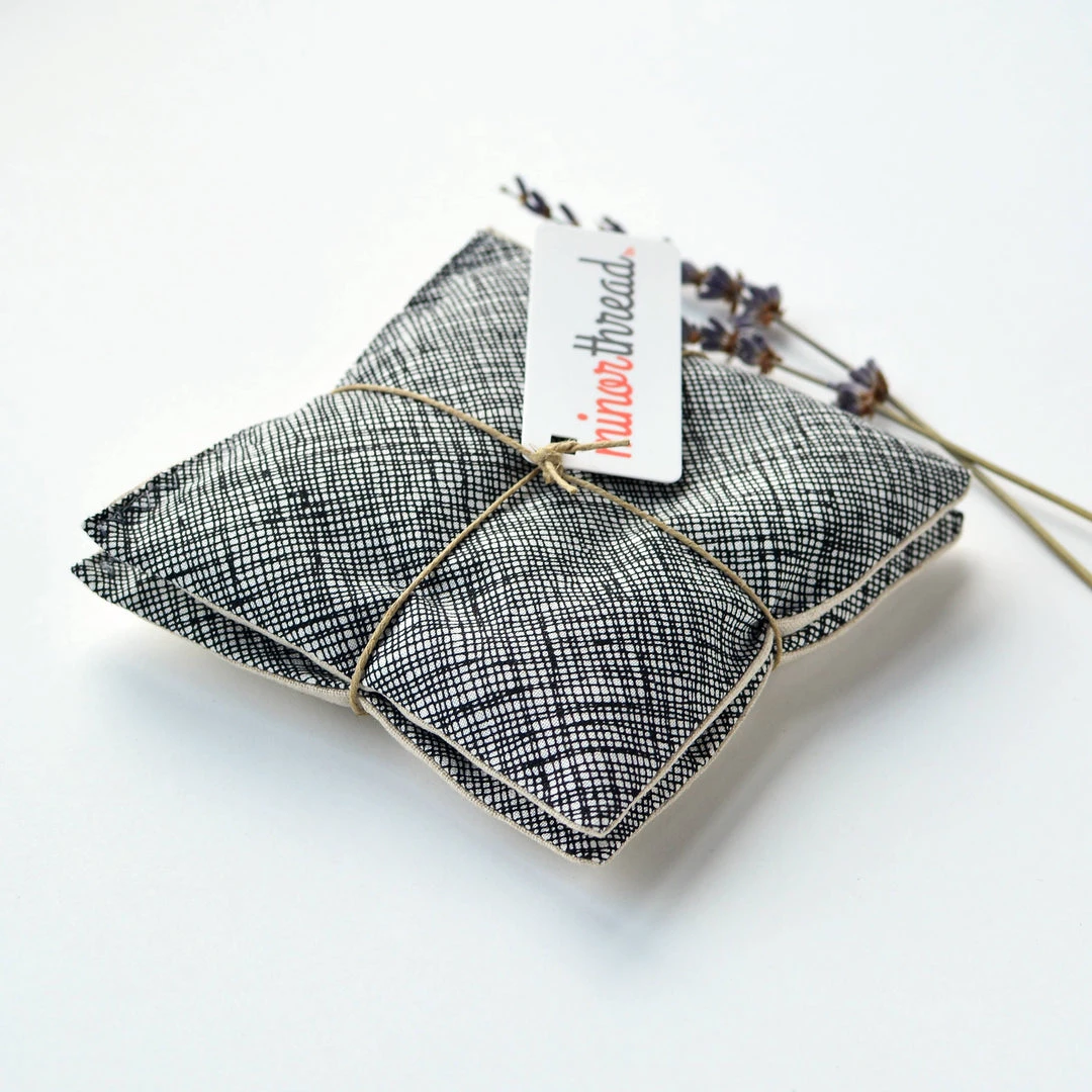 Our soothing, fragrant lavender sachets are bundled in sets of 2, tied with hemp twine and topped with a hang tag. These sachets make a wonderful gift, year-round. Each sachet is approximately 4 1/2″ x 4 1/2″, filled with 4 oz. (by volume) of organic lavender flowers. These sachets are made with a black and white crosshatch print cotton fabric and natural linen fabric.