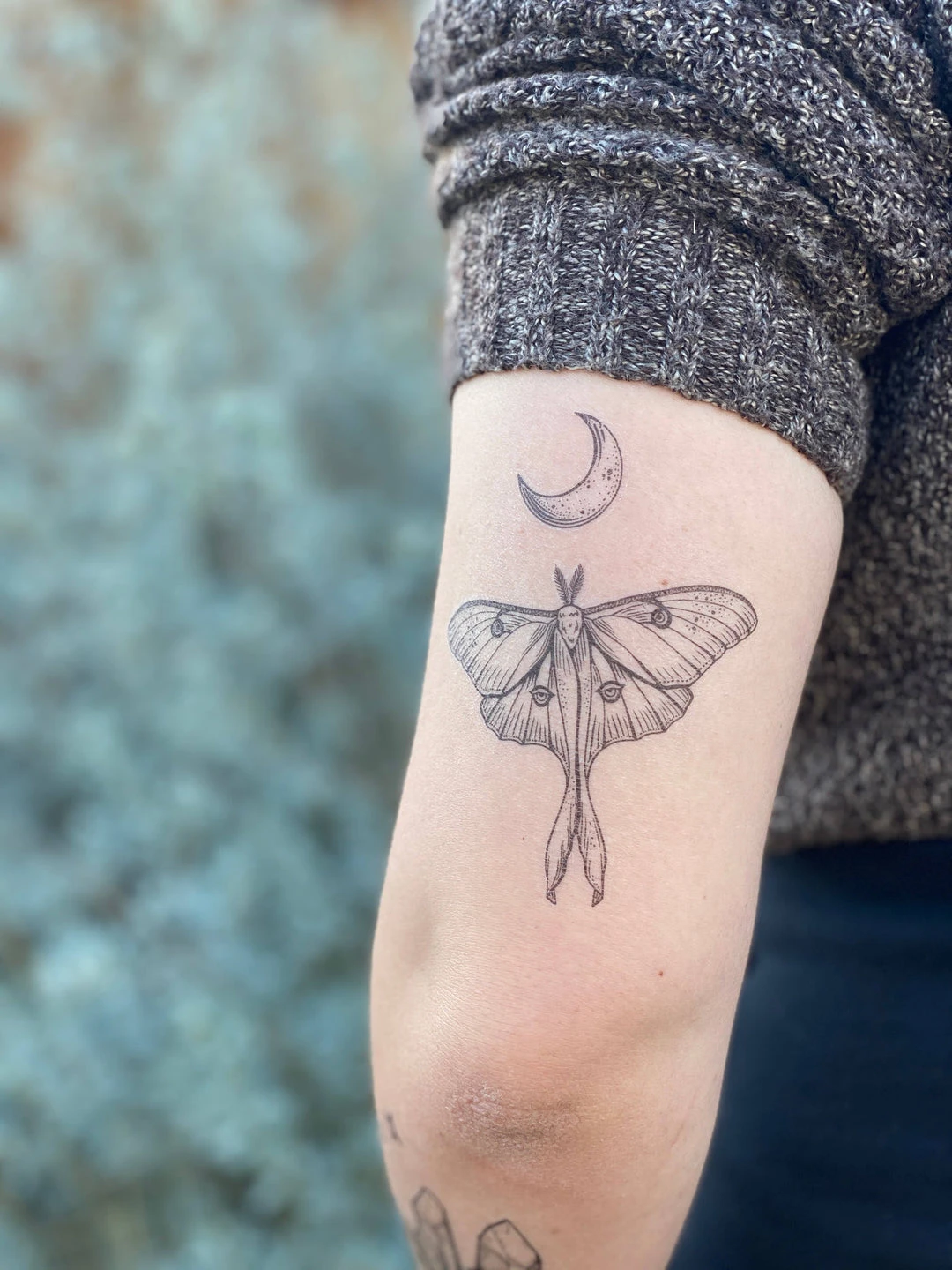 Luna moths are a pale green moth, with small eye-shaped patterns on each wing. Their wings each have an elongated double ribbon-like tail, which is one of their most recognizable features. This original hand-drawn design has a furry little body, a wide wingspan, and a crescent moon above.