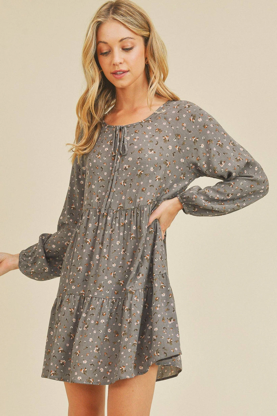 Crinkle Ditsy Floral Dress. Keyhole with tie knot, peasant sleeves, above knee length, tiered design.