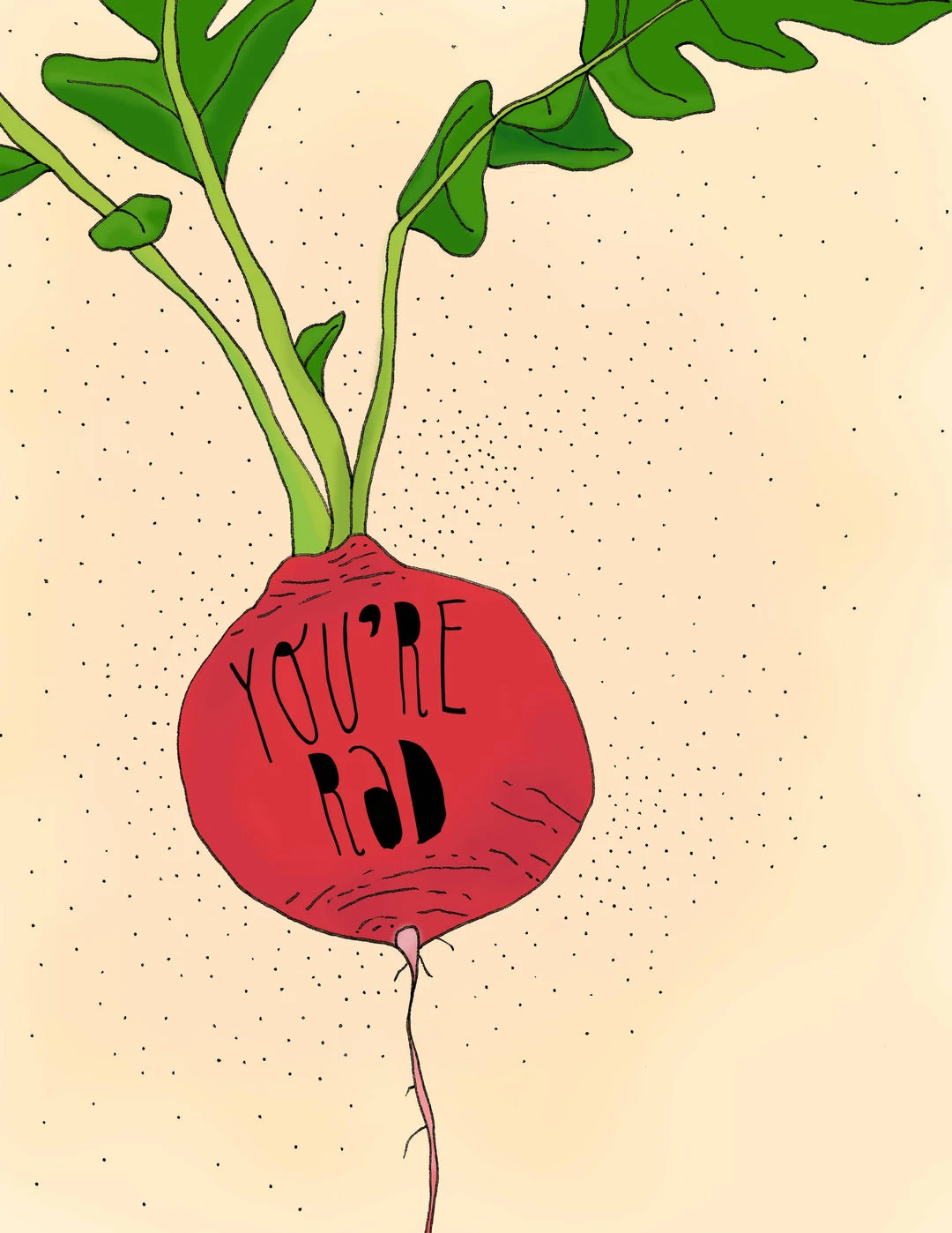 Send more mail with this A2 card (4.25″ x 5.5″) card! The front features illustration of a radish and reads “You’re Rad”. The inside is left blank for a personal message.