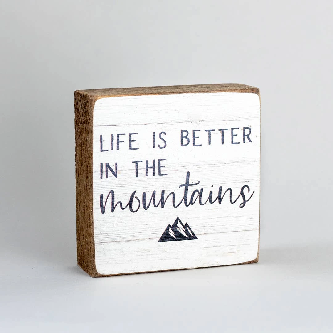 Life is Better in The Mountains Square rustic blocks are a fun way to add personality to any shelf or mantel; the perfect shelf sitter! Our high-quality home décor is handcrafted and made to complement any room. Each piece is uniquely handcrafted in Massachusetts and made to order.