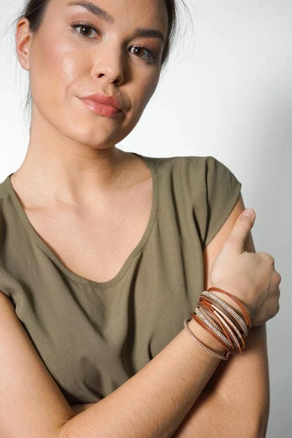 We want you to flaunt your fashion! The Flaunt Leather Wrap Bracelet features layered cord strands with a metallic shine, as well as crystal details and metal accents. The magnetic closure makes this piece easy to slip on and off.