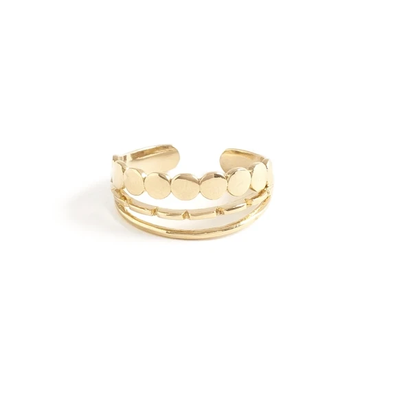3 Row adjustable ring: circles, straight, texctured row. Made out of plated gold & brass.