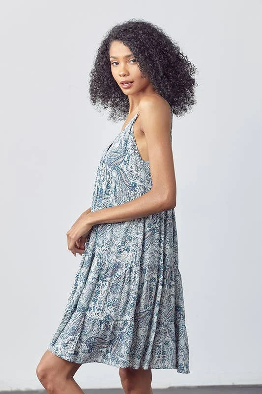 PAISELY PRINT MINI DRESS WITH DEEP V-NECKLINE. FEATURING GATHERS AT THE BUST, ADJUSTABLE STRAPS, AND TIERED BOTTOM. THIS BREEZY DRESS IS THE PERFECT OUTFIT FOR A SUNNY DAY.