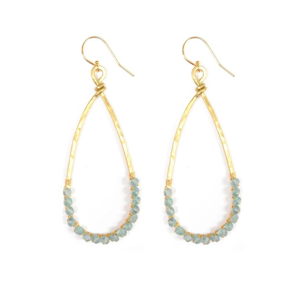 These long hammered and wire wrapped earrings are beautiful. They are 2″ long and available in many stones. The tear drop shape is brass and the ear wires and gold filled.