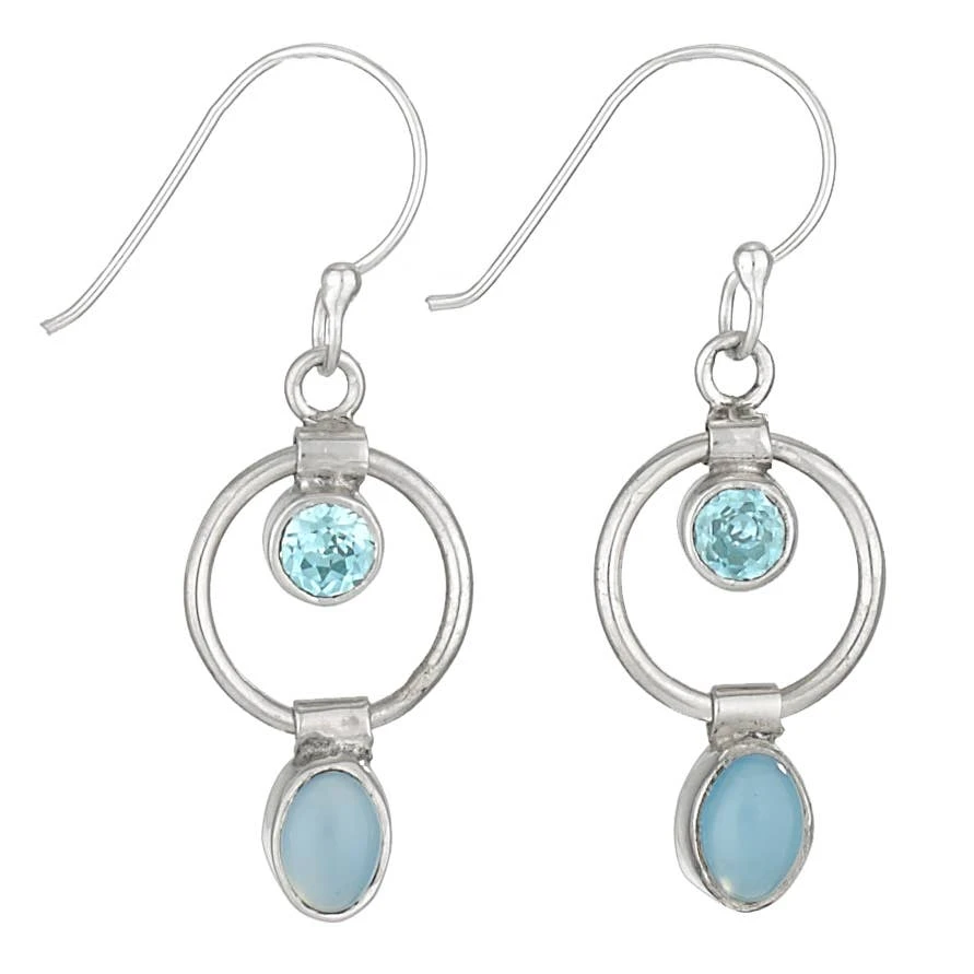Handcrafted round sterling silver dangle earrings with chalcedony and blue topaz.