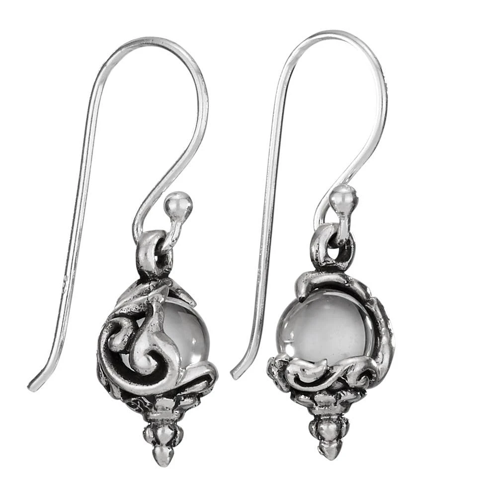 Quartz Crystal Ball Earrings Encased in Decorative Sterling Silver.