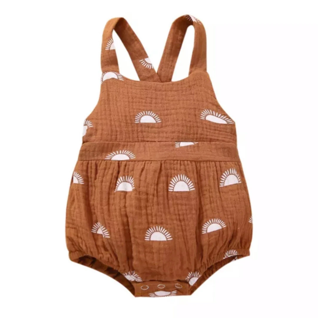 This stunning sunset romper is one of our favorites. Functional snaps between the legs make for easy diaper changes. The straps cross in the back which make it extra cute. Pair it with knee socks and tights in the fall for an adorable multi-season look.