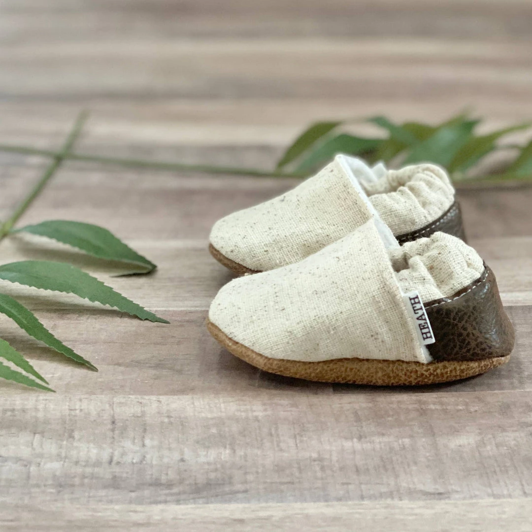 These are one-of-a-kind, handmade moccasins that can be paired with any outfit. Each pair is made with durable cloth and layers of felt and lined with luscious fleece for extra comfort. A heel guard reinforces the quality of the moccasins, while the bottom allows for the baby’s to grip the floor as they learn to walk.